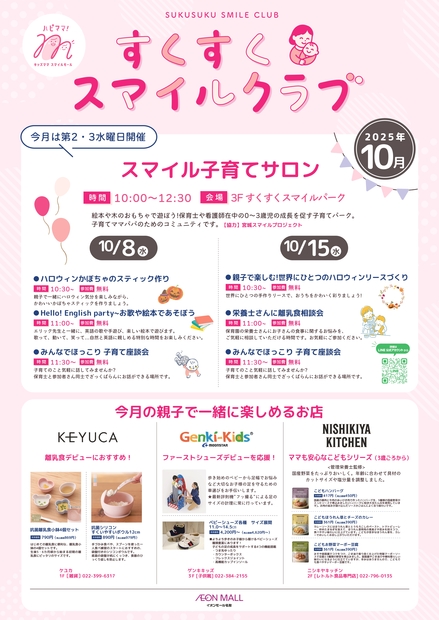 先月よりスタートした、イオンモール名取で開催しております「スマイル子育てサロン」の10月のスケジュールをお知らせ致します。